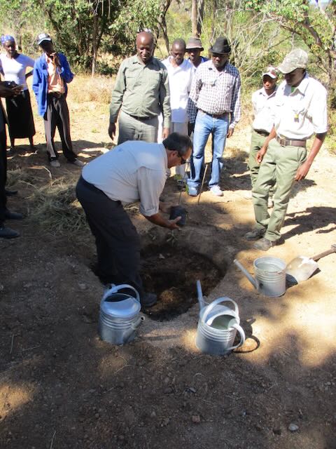 Organized construction of a fresh water solar powered “water hole for elephants” on their migratory route in Hwange National Park.