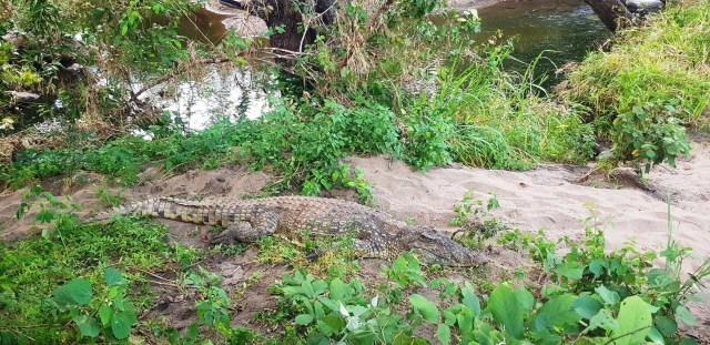 Days later, we brought the big croc to Thuma. Her name is Bush Dog! (In Southern Africa, crocodiles are called Flat Dogs.)